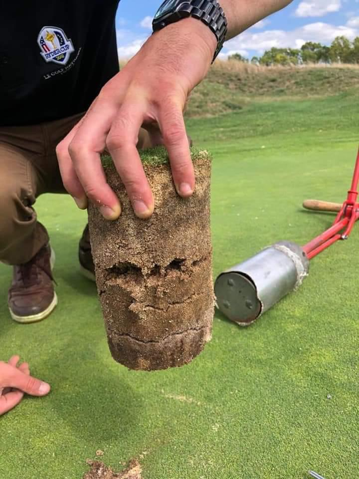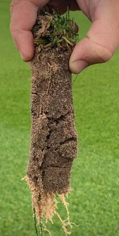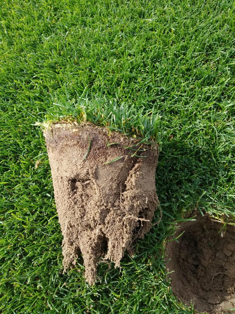 The pictures on the right are from a French customer that uses our products in a year round program. The root depth doubled in one season using the products on both Greens and Tees. Tee boxes recovered faster from divots and ball marks on greens were less visible also. Prograss bio's products when combined in the program also reduced the need for other products and reduced the number of inputs needed on the golf course.